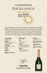 O espumante traz a memória de Chandon Excellence acrescida de características singulares e irreproduzíveis da safra de 2008. Foi uma safra especial, de destaque na história vitivinícola brasileira, por ter apresentado uma sequência climática próxima do ideal para as uvas que são a base do espumante: Chardonnay e Pinot Noir. Com 50,7% de Pinot Noir e 49,3% de Chardonnay, Chandon Excellence Magnum Safra 2008 foi elaborado pelo “método Chandon”, no qual a segunda fermentação acontece da forma mais lenta possível, tendo como resultado a complexidade e a textura dos espumantes Chandon, originando esta cuvée com aromas complexos de frutas cristalizadas, avelãs, amêndoas, especiarias doces, ameixas pretas com toques de torrefação em um paladar vivo e untuoso ao mesmo tempo, ricamente estruturado e com longa persistência final.