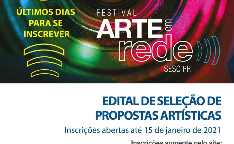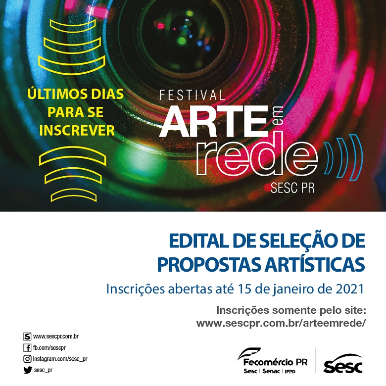 Uma ótima oportunidade para os artistas do Paraná está na reta final do período de inscrições: o edital Arte em Rede do Sesc Paraná, uma iniciativa que busca auxiliar os profissionais da Cultura no atual contexto ocasionado pela pandemia do novo coronavírus, que impactou os espaços e atividades culturais desenvolvidas. Os interessados devem realizar a inscrição até o dia 15 de janeiro no site do evento, que vai selecionar propostas artísticas em vídeo para composição de uma programação on-line a ser disponibilizada no segundo trimestre deste ano.