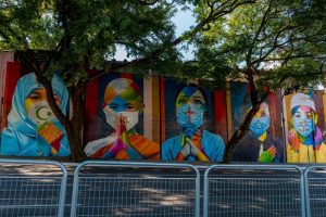 No mural, Kobra retrata crianças de cinco religiões – Islamismo, Budismo, Cristianismo, Judaísmo e Hinduísmo. A obra traz uma mensagem de fé e de esperança, ao mesmo tempo em que lembra as vítimas do Covid-19 e destaca a importância da Ciência, simbolizada pelo fundamental uso de máscaras