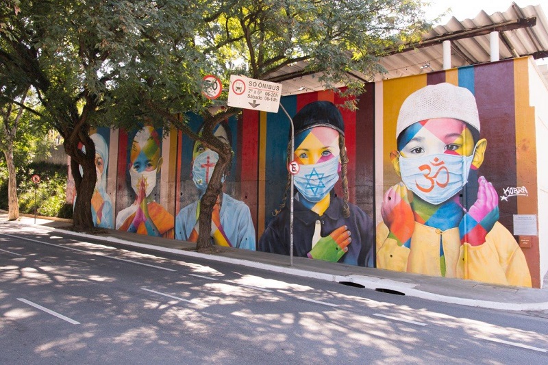O conhecido muralista Eduardo Kobra inaugurou o mural “Coexistência – Memorial da Fé por todas as vítimas do Covid-19”, feito inicialmente em uma tela, no ano passado. O mural de 28 metros de largura por 7 metros de altura, fica na rua Henrique Schaumann, em frente à Igreja do Calvário (na esquina com a rua Cardeal Arcoverde), na zona Oeste de São Paulo. Kobra retrata crianças de cinco religiões – Islamismo, Budismo, Cristianismo, Judaísmo e Hinduísmo. A obra traz uma mensagem de fé e de esperança, ao mesmo tempo em que lembra as vítimas do Covid-19 e destaca a importância da Ciência, simbolizada pelo fundamental uso de máscaras. “Da mesma forma que Deus deu ao homem o dom da arte, também dotou o ser humano da capacidade da produzir Ciência. Por isso não há qualquer contradição em acreditar em Deus e, também, seguir as recomendações dos especialistas no combate ao Covid-19”, diz o muralista, que trabalhou no mural durante 20 dias, atrás de tapumes, para evitar aglomerações.