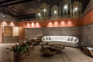 E para finalizar, o espaço Lounge ITAIPU da arquiteta Vânia Toledo Martins, recebeu o padrão Arinto, um dos lançamentos de 2018. Concreto, couro, madeira e tecido fundem-se para formar uma superfície distinta e elegante. Um revestimento luxuoso, híbrido e perfeito, de fácil composição nos ambientes. Em mescla de tonalidades neutras, proporciona uma excelente combinação com madeirados de tonalidades claras, médias e escuras. Compõe facilmente com outros padrões de tecidos e fantasias.