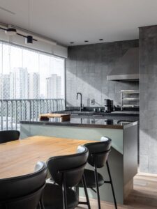 A integração total do living com a varanda gourmet redefine o espaço como um grande ambiente social. A varanda assume com naturalidade a função de sala de jantar, com uma mesa de madeira maciça de bordas orgânicas. A conexão entre estar, cozinhar e receber é fluida e precisa, marcada pelos tons de cinza e preto, e acentos em verde profundo — um conceito arquitetônico que traz profundidade, sem pesar.