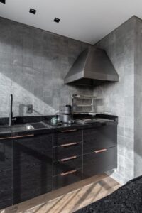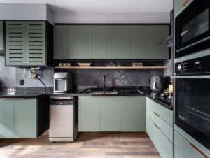 Na cozinha, o cuidado com a estética não compromete a eficiência. A marcenaria em verde sálvia fosco, combinada ao granito preto São Gabriel, cria um contraste elegante, reforçado por detalhes metálicos em preto e cobre. A lavanderia, integrada ao conjunto de forma discreta, é camuflada com portas ripadas que garantem ventilação e continuidade visual — uma solução que une design e inteligência.