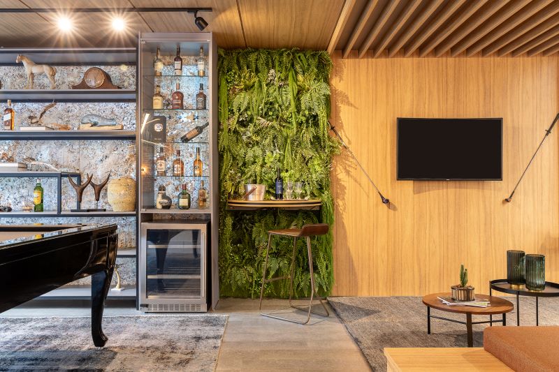 O Smart Home Sebrae, do arquiteto Luiz Maingué, é um apartamento de 65 m², criado com soluções sustentáveis e escolhas inteligentes, baseadas na saúde e bem-estar pessoal e social do morador. Ao convidar os visitantes para uma reflexão sobre o ser humano, o profissional buscou trazer uma atmosfera natural, misturando texturas como pedra, madeira e vegetação e compondo o local com coifa, fogão, refrigerador, gaveta aquecida, adega, icemaker e micro-ondas.