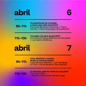 Na semana seguinte, entre 6 e 7 de abril, inovação retoma ao palco nas vozes da estilista Flavia Aranha, Fernando Bertolucci (Suzano), Flávio Grynszpan (iCorpsBrasil), Lia Coelho (SciGrow), Ana Carla Fonseca (Garimpo de Soluções), Olivia Merquior (DACRI DEVIATI), Léo Rodrigues (VTEX), Cairê Moreira (Renner), Fred Gelli (Tátil) e Ricardo Catto (Chie e Grupo Anga).