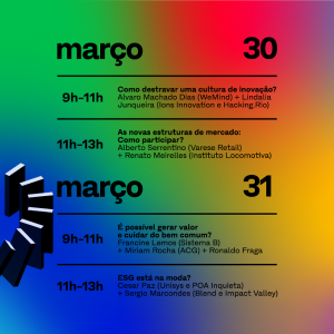 Nos dias 30 e 31, temas como cultura de inovação, ESG, mercado e bem comum percorrem os talks conduzidos por Alvaro Machado Dias (WeMind), Lindalia Junqueira (Hacking.Rio), Alberto Serrentino (Varese Retail), Renato Meirelles (Instituto Locomotiva), Francine Lemos (Sistema B), Miriam Rocha (Negócios Criativos), Cesar Paz (Unisys/POA Inquieta, Sergio Marcondes (Blend/Impact Valley) e o estilista Ronaldo Fraga.