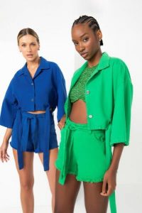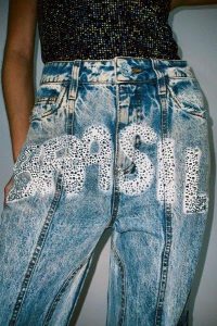 A coleção copa da marca traz de volta a tendência dos patches – bottons de tecido – promovendo para o jeans um visual super cool e descontraído. Outra opção mais elegante são os conjuntos monocráticos compostos por shorts e jaqueta cropped, disponíveis em paetê ou denim. Também foi desenvolvida para o drop, uma blusa com estampa exclusiva com pinceladas em verde, azul e amarelo representando as cores da bandeira.