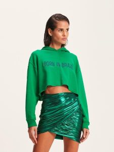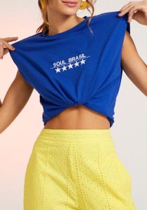 A label investiu em moletons croppeds, disponível em duas opções de cores verde e azul, para torcer com conforto, sem deixar o estilo de lado, além de uma regata amarela com recorte cavado, super trend. Para complementar o visual aposte em bonés tornando o look divertido e despojado.
