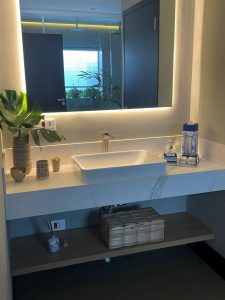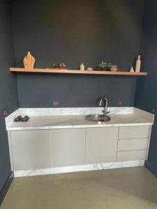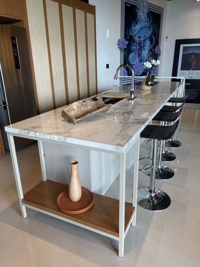 O showroom do Studio incorpora a beleza das pedras da linha Infinity da Gramarcal, destacando a elegância do Calacatta Magnifico polido e o refinamento do Statuario Príncipe acetinado. A Gramarcal é a única no Sul do País a contar com as lâminas Infinity, reforçando ainda mais a exclusividade desta parceria. “A escolha do produto se deu em função do conceito da loja, que está muito ligado à sustentabilidade, materiais duráveis, elegantes e de fácil limpeza, predicados que são encontrados neste produto da Gramarcal”, explica Juliane Manieri, empresária e proprietária da loja.