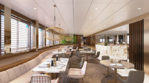 O restaurante La Cucina, conceito gastronômico da Emerald Cruises, passará a operar com novo design, incluindo cozinha aberta. O superiate também contará com o Night Market Grill, espaço gastronômico privativo com capacidade para até oito pessoas, mediante custo adicional.