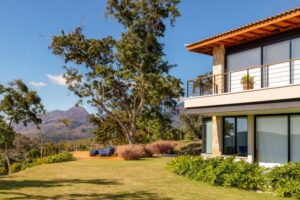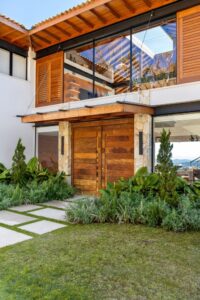 Com estilo contemporâneo de inspiração toscana, o projeto foi concebido em dois meses e executado em apenas 28 dias — resultado de uma leitura precisa do lugar e de suas relações com o entorno. Inserido no bioma da Mata Atlântica, o paisagismo valoriza espécies nativas e resilientes, de baixa manutenção e fácil manejo, como lavanda, alecrim, agapanto, azaleia, viburno e jacarandá-mimoso. “Buscamos provocar estímulos e sensações, criando uma convivência harmônica entre o natural e o construído”, explica Júlio Sousa.