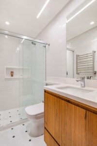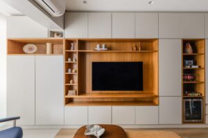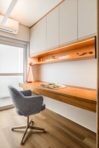 Entre as soluções que revelam o cuidado do processo, estão a geladeira embutida na marcenaria e a tampa em pedra sobre o tanque, que amplia a área de apoio e preserva a estética do espaço integrado. “Buscamos um equilíbrio entre o prático e o acolhedor, respeitando a forma como o casal realmente vive o dia a dia”, comenta Stella Teixeira, arquiteta responsável pelo projeto.