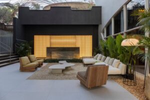 Neste espaço de 170 m², a arquiteta Bruna Raid propõe um convite à pausa. Estar da lareira, bar e lounge se articulam em uma narrativa que celebra a introspecção e o encontro. A paleta de beges, marrons e verdes reforça o caráter natural do projeto, enquanto o porcelanato Metrópolis SGR Hard no formato 120×120 cm da Portinari, antiderrapante,é ideal para áreas externas eatua como base visual de todo o ambiente. Com aparência cimentícia, acabamento granilhado e toque levemente áspero, o produto combina sofisticação, resistência e textura atemporal. O uso de materiais têxteis, madeira e elementos artesanais amplia a sensação de aconchego. Peças assinadas por Jader Almeida, Zanine Caldas e Ruy Ohtake conferem sofisticação ao mobiliário, enquanto a obra da artista Maria Helena Andrés adiciona um toque de memória e brasilidade. Destaque para o painel de muxarabi com tecido de linho tensionado, que contribui para a atmosfera acolhedora e contemplativa do ambiente.