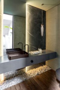 Niê Giardino – por Izabella Stambassi Arquitetura – Na parede do lavabo a lastra Marquina da Portinari – Fotos: Jomar Bragança