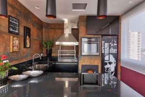 Na varanda gourmet, a arquiteta enfatizou a paixão do morador pelo filme ‘The GodFatther’, um clássico dirigido por Francis Coppola