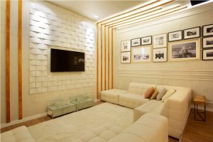 No living, Erika apostou na elegância e no aconchego, usando ripas de madeira na decoração; o sofá em capitonê que envolve toda a sala, deixando o espaço convidativo para os visitantes; e o quadros emoldurados dão o toque final de charme. A perfeita harmonização das combinações de cores, texturas e iluminação é a tendência para qualquer ambiente.