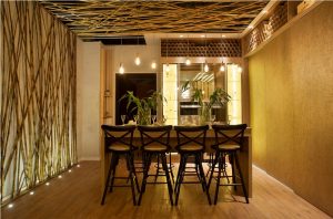 Na cozinha gourmet, revestiu de cortiça as portas da marcenaria ao invés de vidro ou madeira, proporcionando uma agradável sala de jantar quando as portas estiverem fechadas. “Optamos pelo revestimento em papel cortiça, pois diminui significativamente o custo com a marcenaria”, explica Erika Natario. Seguindo o conceito do reaproveitamento de materiais, tubos de papelão foram usados com o propósito de criar uma adega, na iluminação ripas em madeiras de demolição, e os bambus para a decoração do ambiente. “Quando começamos a pensar neste ambiente queríamos usar materiais reciclados, baratos e que são facilmente encontrados no nosso dia a dia”, conta a arquiteta.