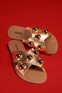O grande destaque fica por conta das maxiesferas, enfeites aplicados que remetem diretamente às tradicionais bolas natalinas – um detalhe que desperta a memória afetiva e adiciona um toque divertido às produções de verão. As esferas aparecem em acabamentos cromados metalizados (ouro, prata e cobre) e em cores vibrantes, iluminando as sandálias e papetes, criando um efeito sofisticado e, ao mesmo tempo, leve.