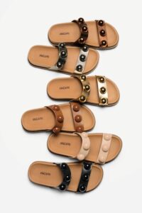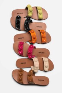 A paleta da coleção combina tons festivos e solares: os metalizados reforçam a atmosfera de celebração, enquanto amarelo, rosa e laranja traduzem o alto verão em sua forma mais calorosa. O vermelho, além de ser um clássico da data, aparece como uma das cores mais desejadas da temporada. Entre os materiais, destaca-se o couro, que garante durabilidade e acabamento premium, e o PVC injetado com palmilha anatômica nas papetes, proporcionando conforto imediato.
