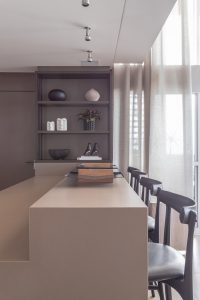 Neste apartamento, a bancada promove a divisão entre a cozinha e a sala de jantar, que são integradas. Revestida em Silestone Unsui, uma pedra composta por quartzo natural em sua maioria, apresenta excelente durabilidade. Com isso, a arquiteta conseguiu criar um espaço para refeições rápidas, apoio para o manuseio de ingredientes e que também atua como suporte para drinques, pratos finalizados, louças e talheres durante um evento especial, uma vez que a sala de jantar está logo atrás.