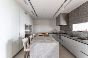 Nessa bancada extensa da cozinha, que serve como apoio na hora de cozinhar ou para as refeições diárias, o material utilizado foi o Quartzito Silver |Foto: Leandro Moraes