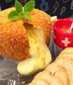 Em uma panela pequena, coloque o óleo, em quantidade suficiente para fritar o queijo por imersão. Quando o óleo estiver quente, abaixe o fogo e coloque o queijo empanado. Frite até ficar dourado, retire e deixe escorrer o excesso de óleo. Aguarde alguns minutos e sirva acompanhado de geléia de frutas vermelhas, damasco ou pimenta.
