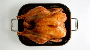 Retire o peru da geladeira 2 horas antes de colocá-lo no forno pré aquecido a 180ºC. Leve-o ao forno coberto com o papel alumínio por cerca de 3 a 4 horas. A cada meia hora, use o caldinho da assadeira para regar o peru. Para saber se está no ponto, a carne fica macia e as coxas se movem facilmente. Quando estiver no ponto, remova o papel alumínio e deixe a ave no forno por mais 20 minutos para dourar. Depois, retire do forno e transfira o peru da assadeira para a travessa em que será servido.