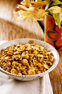 Em uma frigideira aqueça a manteiga e o azeite, e adicione, o orégano, o sal, o cominho em pó, a pimenta- do- reino, a pimenta calabresa, a cúrcuma em pó , o amendoim , a castanha de caju, a semente de girassol e misture bem. Retire do fogo, espere esfriar, misture o NESTLÉ CORN FLAKES e sirva a seguir