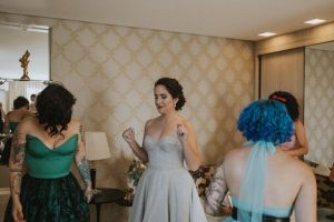 “Desenhei um vestido moderno, romântico e vintage, inspirado nas princesas medievais. O véu, a peça de cabelo vintage e buquê de flores desidratadas também foram pensados para complementar o look, assim como o vestido base, um prata tomara que caia, deslumbrante, que ela poderá usar em festas. Essa tendência vai transformar ainda mais o mercado do casamento”, reforça Juliana Santos.