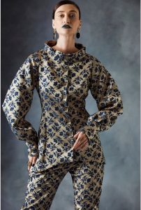 Nos tecidos destaque para o algodão presente em belas camisas e o crepe acetinado nos vestidos. Tudo composto por uma cartela de cores sóbrias, como mostarda, azul, preto e branco. Uma estampa única dourada confeccionada com bordado em azul, fecha o “mood” da coleção.