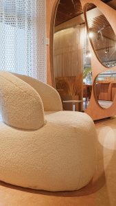 Os mobiliários de destaque são a poltrona giratória assinada pela Lattoog e os chuveiros que ganharam novos significados e foram invertidos, sendo eles transformados em mesinhas de apoio, um toque à parte de criatividade e inovação.