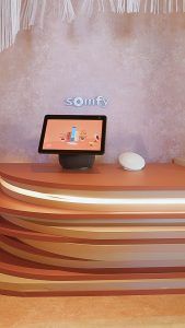 À primeira vista, é possível sentir a leveza do ambiente, desconectar-se do mundo externo e conectar-se ao espaço lúdico e afetivo com uma experiência sensorial, através da leveza das cortinas da Uniflex e dos trilhos curvos desenvolvidos pela Somfy. As cortinas ganham movimento e iluminação através da automação dos trilhos, que foram customizados especialmente para a mostra e resultaram num cenário cinematográfico e privativo.