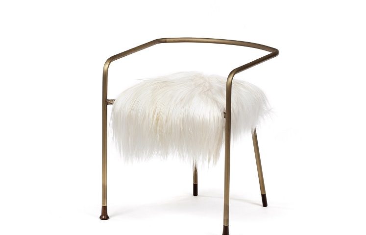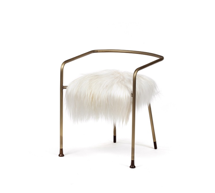 Materiais: base em latão, detalhes dos pés em sucupira, assento em pele de carneiro da Mongólia