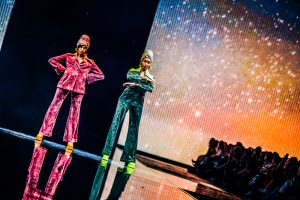 Com o rock no seu auge, a moda dos anos 2000 é muito característica pelas calças com modelagem skinny e de cintura bem baixa, os óculos com lentes coloridas, os croppeds, os cabelos compridos e lisos que ousavam nas cores fantasia. No desfile, as quatro modelos que com looks dessa década representam a autenticidade deste momento na moda.