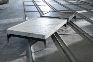 Os mármores naturais brasileiros, Grigio e Bianco Nuvolato, reforçam a singularidade de cada peça, com veios orgânicos moldados pela natureza ao longo do tempo. O metal, aplicado com leveza estrutural e acabamento preciso, completa a composição.