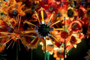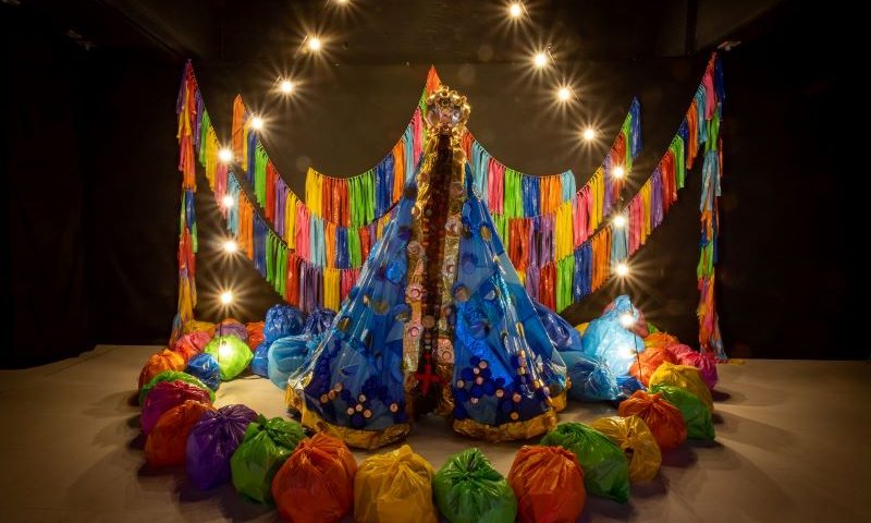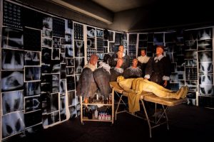 Completa a exposição VIDA – Histórias da Pandemia um conjunto de três instalações do artista visual, designer e figurinista Gustavo Krelling totalmente confeccionadas com materiais inusitados e descartáveis, tratando de questões como: vida e morte, aceitação e negação, lixo e ressignificação. A primeira delas é uma releitura da obra de arte “A Lição de Anatomia do Dr. Tulp”, do pintor barroco holandês Rembrandt, representando a união entre arte e ciência médica. “A releitura é feita com materiais hospitalares inusitados, as golas rufo do período são feitas com gaze tingida, máscaras descartáveis, luvas, seringas, radiografias e outros materiais do universo médico que estiveram presentes em nosso cotidiano recente. Trazemos a obra barroca para a contemporaneidade e levantamos reflexões sobre o período pandêmico que estamos atravessando de uma maneira artística”, explica Krelling, que somente nos trajes da cena utilizou 2 mil pedaços de gaze tingida costurados em patchwork. “As instalações do Gustavo trazem a textura humana do artesanato para dentro da exposição. Então, temos uma coisa mais hi-tech, das projeções em vídeo, mas também temos o elemento feito à mão, trabalhado por ele”, comenta Guerra.