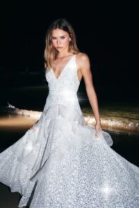 Os materiais realçam a estética fresh da linha, com uso de jeans, linho, laise, microfibra, elastano, crochê e viscose, além de acabamentos que valorizam o trabalho manual, como bordados à mão de paetês, aplicação de bolinhas metalizadas, cristais bordados e a incorporação de tachas, que adicionam brilho e personalidade às produções.