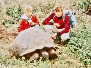 Wilhelm e David Schurmann em Galápagos durante a primeira volta ao mundo da família na primeira foto e Quase 40 anos depois, Wilhelm Schurmann retorna a Galápagos com a família e tripulação da Voz dos Oceanos na segunda foto