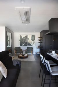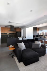 Sendo assim, a mescla da marcenaria – desenhada pelo próprio escritório de arquitetura -, em MDF Carvalho Hannover, mesa de jantar e centro em madeira, banquetas, almofadas e roupa de cama na cor branca proporcionaram a leveza na medida certa neste projeto. E a escolha de um piso mais neutro e com cor mais clara também foi muito importante para gerar um contraste com o preto juntamente com o tapete na cor cru.