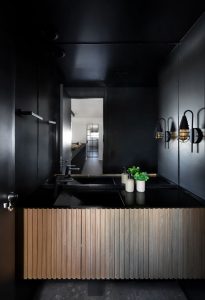 A cor preta prevaleceu em todos os ambientes; na marcenaria (MDF Nero), no mobiliário, nos objetos de decoração, nas bancadas, nos revestimentos hexagonais, colorblock do lavabo, nas portas, metais e eletros. Para quebrar a monotonia desta cor e suas nuances para os cinzas, a Fantato Nitoli Arquitetura compôs uma atmosfera harmônica com diferentes materiais, texturas e acabamentos, para que se evitasse ficar um ambiente muito escuro e pesado.