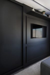 Na suíte, a cabeceira ripada desenhada pelo escritório de arquitetura traz a leveza do MDF em madeira clara em contraste com as portas dos armários e painel da TV em MDF Nero, seguindo a mesma linguagem de cor do restante do apartamento.
