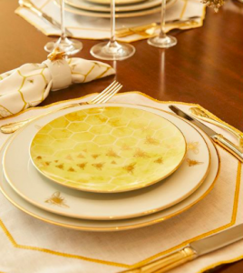 Feitas em porcelana e ouro, possuem tons neutros que permitem a combinação com todas as coleções da marca, possibilitando a criação de composições autênticas à mesa. A marca de luxo traz ainda para a temporada de final de ano, os famosos kits para presentear da coleção Favo de Mel. Estes foram criados para montar a mesa de Natal com elegância e presentear quem você ama com carinho e atenção. Além de compor a ceia com os conjuntos de louças e acessórios, você pode usar as embalagens em formato de colmeia para fazer parte da decoração de Natal.
