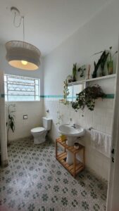 Em uma casa construída em 1960, os banheiros são, além de grandes, cheios de detalhes. De acordo com Marina, os empreendedores que transformaram a casa em um ambiente que abriga negócios criativos queriam manter a personalidade do espaço, que conta a história da edificação. “Neste caso, precisávamos de uma peça que trouxesse equilíbrio com o volume de informações que o banheiro já tinha e, ao mesmo tempo, não conflitasse com tudo o que já existia. O Gaia foi a escolha ideal e se tornou tão protagonista quanto os demais elementos”, diz. O uso de um pendente no banheiro, segundo a arquiteta, surpreendeu e fez do espaço o mais fotografado da casa.