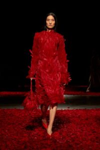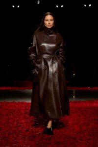 Esse mesmo espírito inspirou os coreógrafos que revitalizaram o movimento Tanztheater nas décadas de 1970 e 1980. “Foi outra época de libertação,” reflete Davis. “A maneira como expressavam o amor através do movimento era inesperada, explorada de um jeito que, mesmo décadas depois, ninguém mais conseguiu replicar.” Ao longo da coleção, as dualidades poéticas das performances do Tanztheater alemão – diálogos emotivos entre amor e desejo, liberdade e controle, romance e paixão – são traduzidas em forma e matéria-prima: trench coats fluidos de cetim ajustados ao corpo com cintos, cashmere macio sobre a pele contrastando com couros brilhantes, plumas achatadas e papoulas desabrochando em hastes semelhantes a fitas.