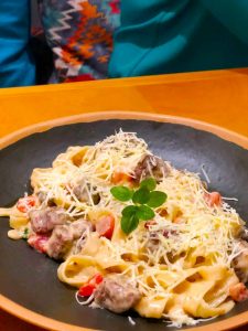 A Chef Carol Resck acrescentou ao prato, como ingredientes, além da massa artesanal e os dois tipos de queijos, um creme de leite fresco, vinho branco, noz moscada, manteiga, pimenta do reino, orégano fresco e tomate. A combinação da massa fresca com o filet mignon, aliada ao creme e os demais insumos, tornaram o prato irresistível.