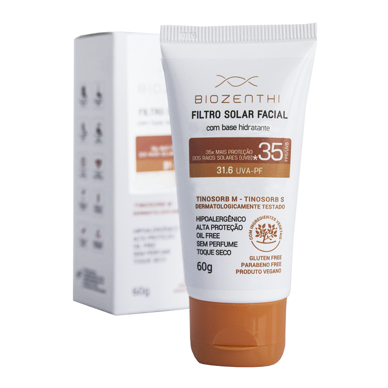 Para impedir danos solares ligados ao envelhecimento precoce (e ao aumento do potencial de cancerização da pele), o Filtro Solar Facial Hidratante da Biozenthi oferece FPS 35 e PPD 31.6, garantindo proteção solar física e química de amplo espectro. No caso do Filtro Solar Facial Hidratante Biozenthi, a proteção contra UVA, de PPD 31.6, é quase a mesma que a UVB. O Filtro Solar Biozenthi conta com dióxido de titânio, um conhecido ingrediente eficaz ao conferir fotoproteção física (refletindo a radiação). Com toque seco, o produto é oil free e conta com ingredientes inovadores, como o Tinosorb M e Tinosorb S, que garantem maior proteção solar por ser uma nova classe de absorvedores capazes de tanto absorver como refletir energia solar. Disponível em três versões (base nude, base clara e base média), os fotoprotetores têm uso seguro para veganos, por contar com ingredientes vegetais e orgânicos, não ser testado em animais, além de livres de glúten.