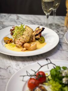 O chef Silvonei Souza, do restaurante Trinitas, que fica no piso térreo do complexo, preparou dois cardápios de três tempos cada, sendo uma opção vegana. Nessa modalidade, os casais poderão desfrutar de um couvert com uma trilogia de mini bruschettas nos sabores napolitana, presunto parma com gorgonzola e damasco, e salmão marinado com endro e queijo cottage. Como entrada, o chef criou um caldo de batata salsa com shimeji grelhado e crocante de alho-poró. Na sequência, o prato principal tem inspiração mar e terra, com um filé mignon com bacon e tempurá de camarões, acompanhado de conchiglione de brie e coulis de mostarda Dijon. Para adoçar, uma seleção da chef pâtissier Líria Gabriel que servirá strudel de pera ao vinho tinto; macaron Amarena; trufas de cacau e avelã, e crosta de coco de cupuaçu cremoso.