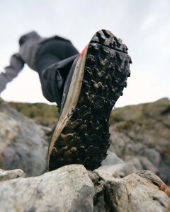O solado é feito de 31% de borracha amazônica com ranhuras multidirecionais para uma boa aderência e estabilidade.