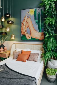O toque handmade fica por conta da palha, presente na cabeceira da cama e no tapete do rústico. A paleta cromática passeia pelos tons terrosos e neutros, nos objetos decorativos e mobiliário da Masotti Curitiba, que se complementam ao verde musgo da parede e às cores naturais das plantas.
