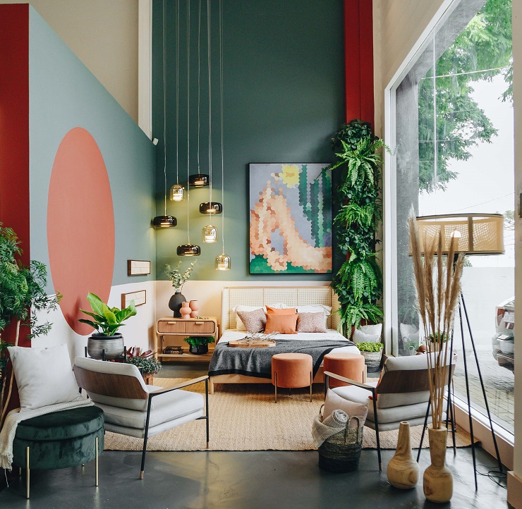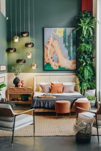 O toque handmade fica por conta da palha, presente na cabeceira da cama e no tapete do rústico. A paleta cromática passeia pelos tons terrosos e neutros, nos objetos decorativos e mobiliário da Masotti Curitiba, que se complementam ao verde musgo da parede e às cores naturais das plantas.